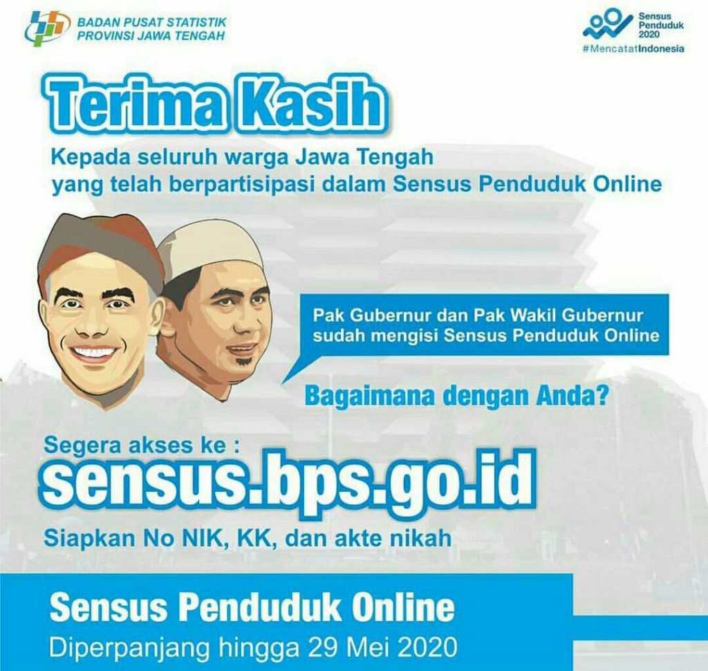 KecMranggen-Â Diberitahukan kepada seluruh warga indonesia Bahwa Sensus Penduduk Online di perpanjang hingga 29 mei 2020, mudah dan cepat dengan cara siapkan No NIK, KK dan Akte Nikah.