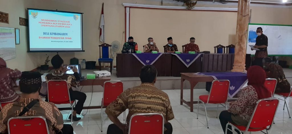 Menindaklanjuti kemungkinan dan adanya benturan double penerimaan bantuan dalam bentuk dan sumber yang lain oleh KPM maka Desa Kembangarum Kec. Mranggen Kabupaten Demak mengadakan Musyawarah Desa Khusus (MUSDESSUS) EVALUASI PENERIMAAN BLTDD BULAN 1 yang dihadiri oleh Ketua BPD Desa Kembangarum Muh Echsan, M.Pd.I, Ketua LKMD Drs. H. Asroi, BABINSA dari KORAMIL 12 Mranggen, Perangkat Desa, Relawan Covid-19 dan Perwakilan Tokoh masyarakat yang dilaksnakan dengan standard Protokoler COVID-19 untuk mevalidasi penerimaan oleh KPM, dan dalam MUSDESSUS tersebut diadakan perubahan KPM sebanyak 15 KPM karena yang bersangkutan telah menerima bantuan yang lain.
