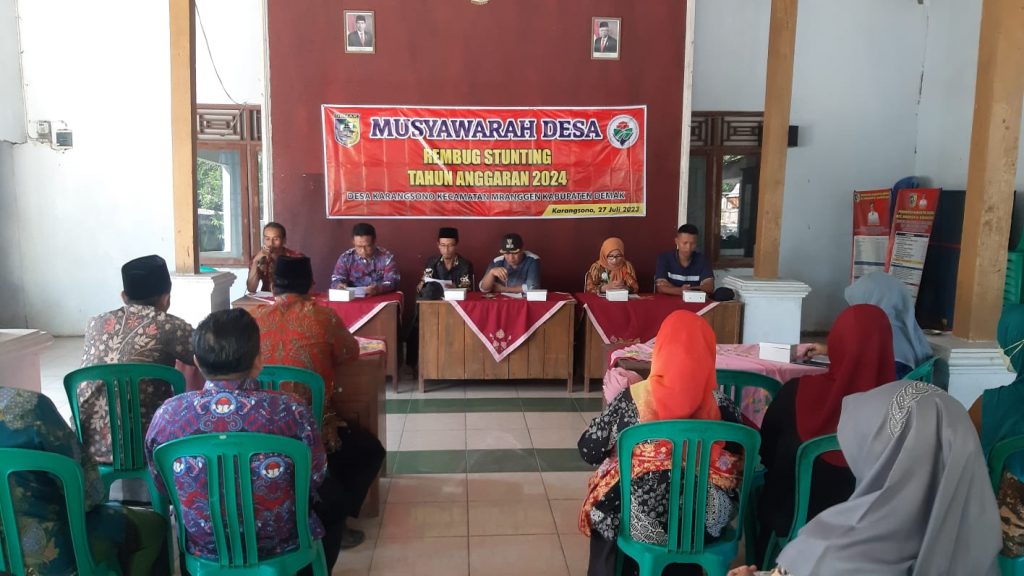 KecMranggen- Hari ini Kamis, 27 Juli 2023 di Balai Desa Karangsono Kecamatan Mranggen Kabupaten Demak telah dilaksanakan Rembuk Stunting Desa Karangsono Kecamatan Mranggen Kabupaten Demak. acara tersebut dihadiri oleh Kades beserta sekdes Desa Karangsono, Perwakilan masyarakat Desa Karangsono, kasi permas berserta staf permas dan Pemerintahan Desa.